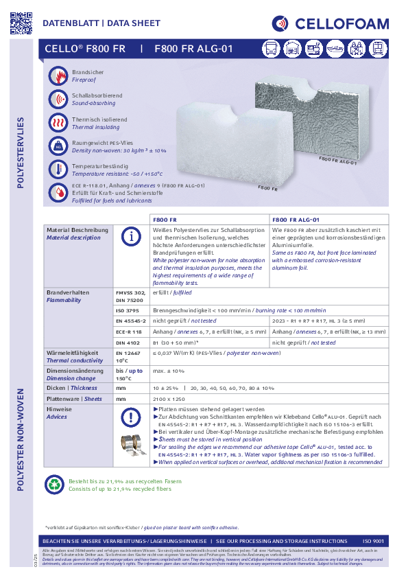 Weißes Polyestervlies mit Aluminiumoberfläche. Cello® F800 FR ALG-01 überzeugt durch seine ausgezeichnete Brandfestigkeit unterschiedlichster Brandprüfungen sowie der Dichtigkeit gegenüber Öl, Wasser und Kraftstoff.
