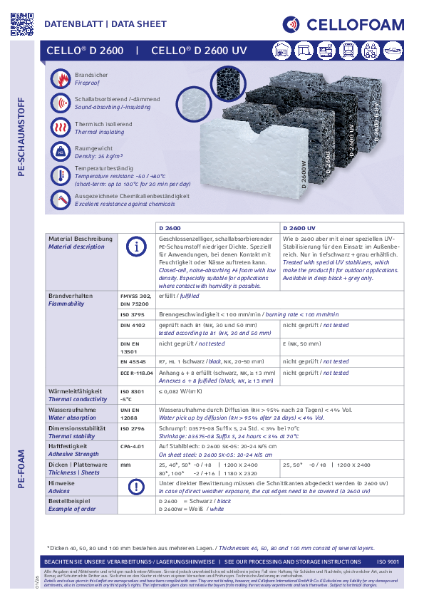 Geschlossenzelliger PE-Schaum mit sowohl schalldämmenden als auch schalldämpfenden Eigenschaften. Cello® D 2600 überzeugt durch seine hohe Stabilität sowie seiner guten Beständigkeit gegen Nässe, Frost und Schmutz.Részletek a termékről